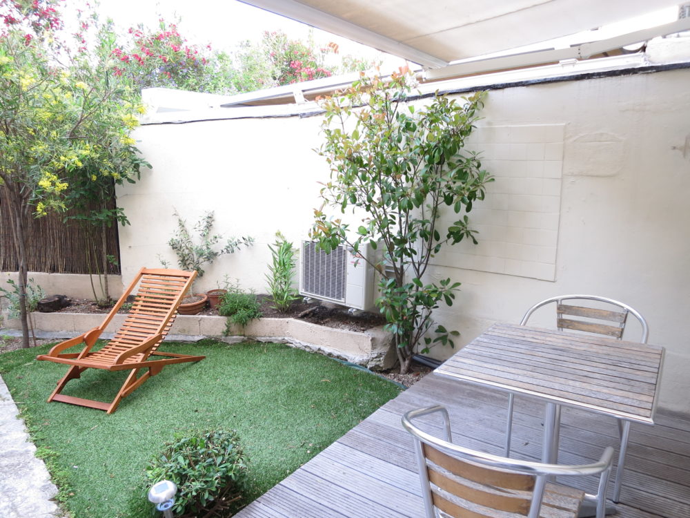 L’appartement s’ouvre sur une terrasse bois équipée et un jardin privé paysagé (mimosas 4 saisons..) .