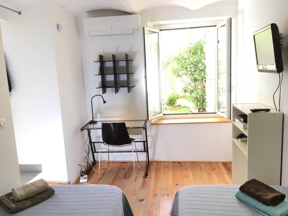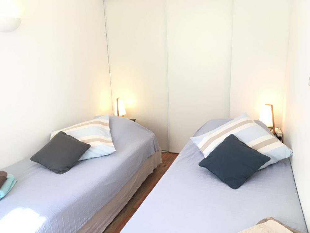 Refait à neuf : cuisine équipée (plaques induction, réfrigérateur, four à micro-ondes, bouilloire, cafetière électrique, grille pain) et coin repas avec porte fenêtre donnant sur le jardin, chambre séparée comprenant 2 lits jumeaux (90×200) très confortables pouvant être joints avec grand placard-penderie, fenêtre avec volets et vue sur le jardin, (doubles vitrages pour toutes les portes et fenêtres). Bureau et étagère.