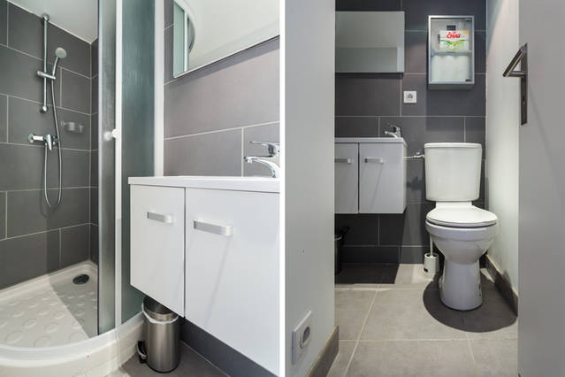 Salle de bains avec douche, lavabo, sèche-cheveux et WC.